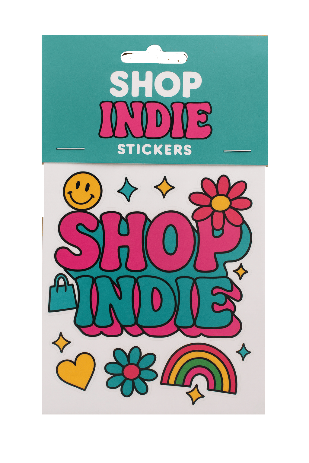Add a pop of indie pride to your laptop, water bottle, or notebook with this colorful Shop Indie sticker pack. Featuring retro-inspired lettering, smiley faces, flowers, rainbows, and hearts, this set is all about celebrating creativity and independent makers. Printed on durable vinyl, these stickers are made to last while keeping things playful and fun.